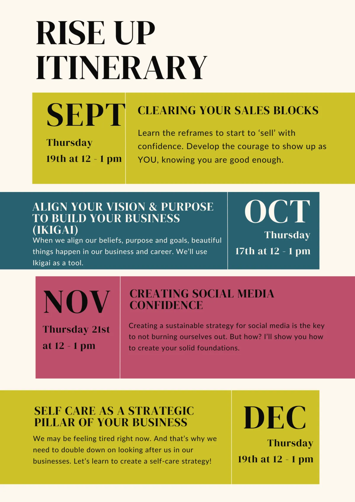 Rise UP is a free monthly community for women to connect, learn + evolve